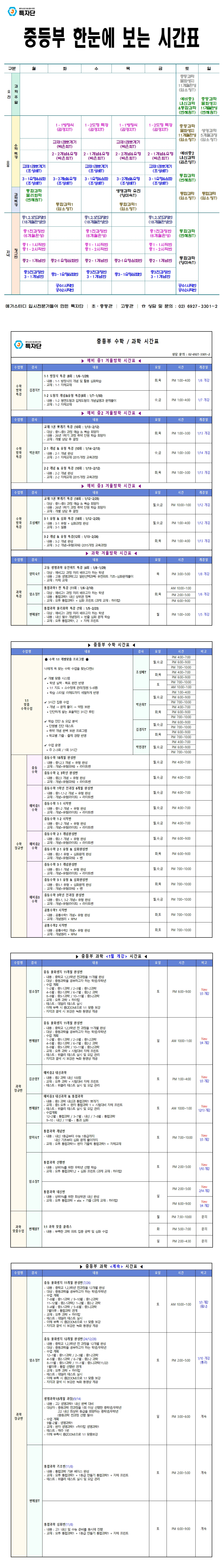 | 중등부 - 수학/과학/국어 시간표 (겨울방학) |