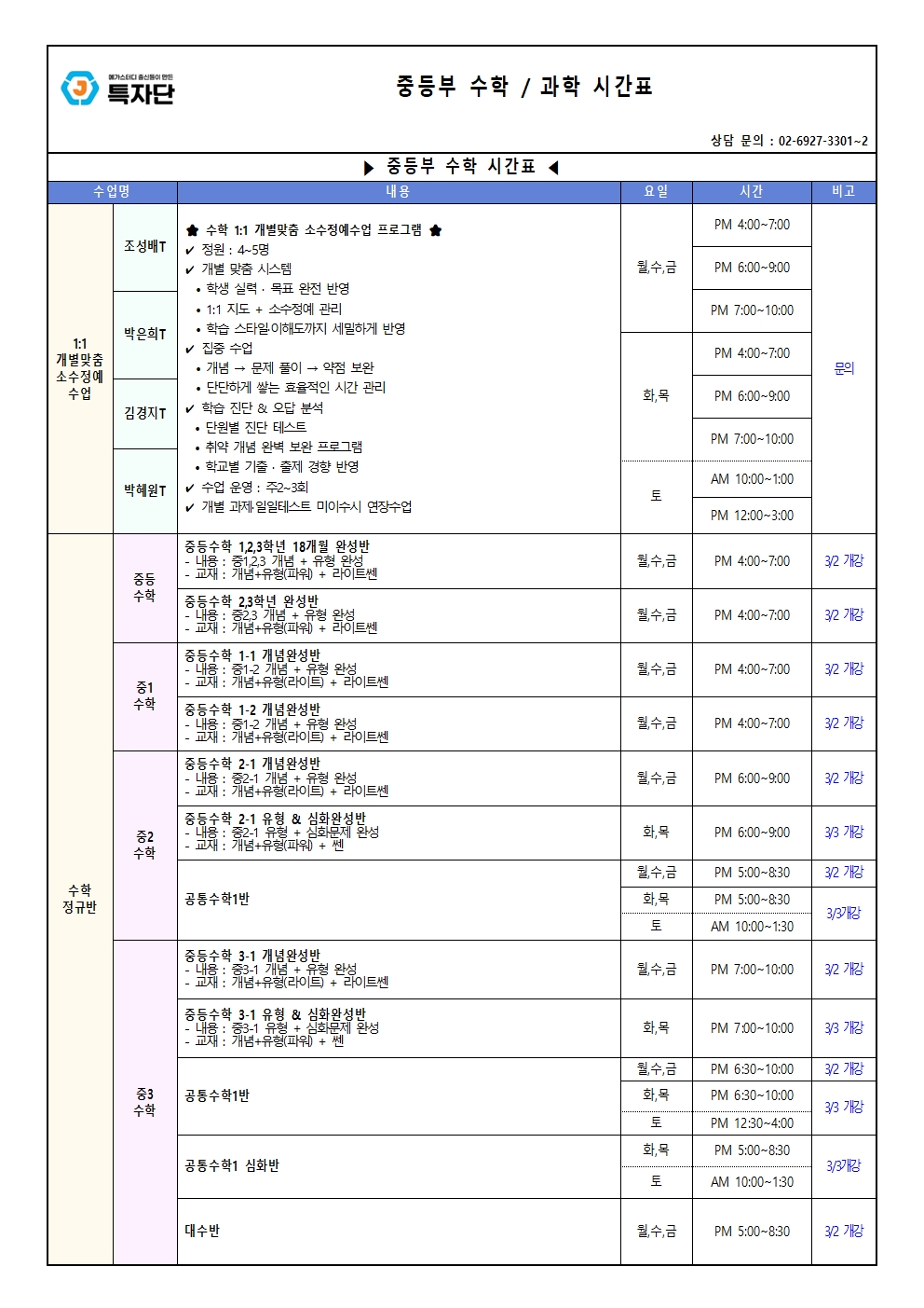 | 중등부 - 수학/과학/국어 시간표 (3월) |