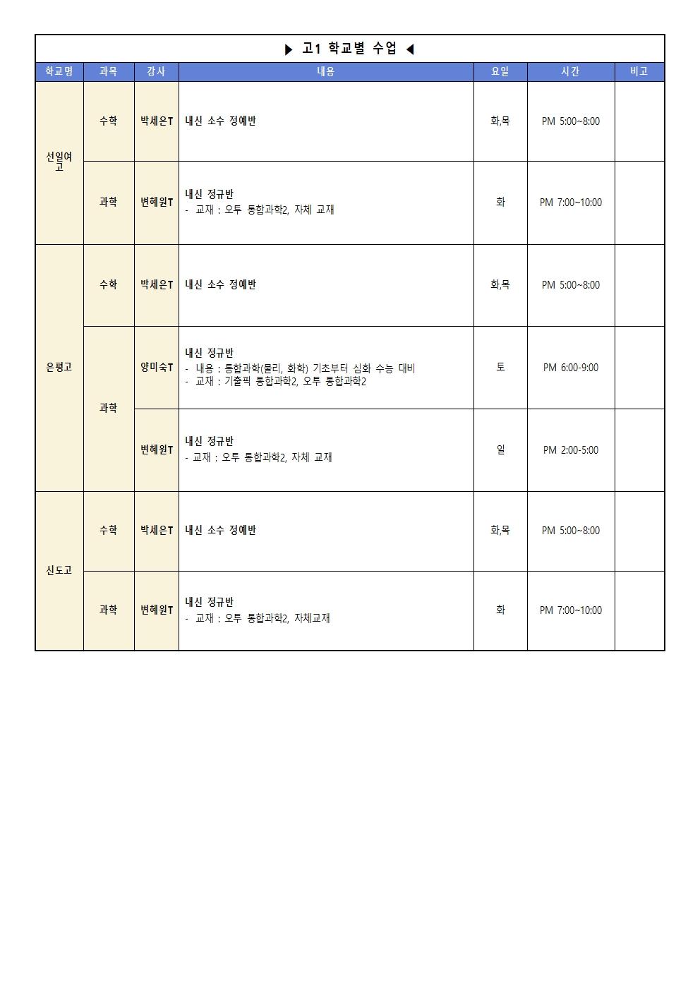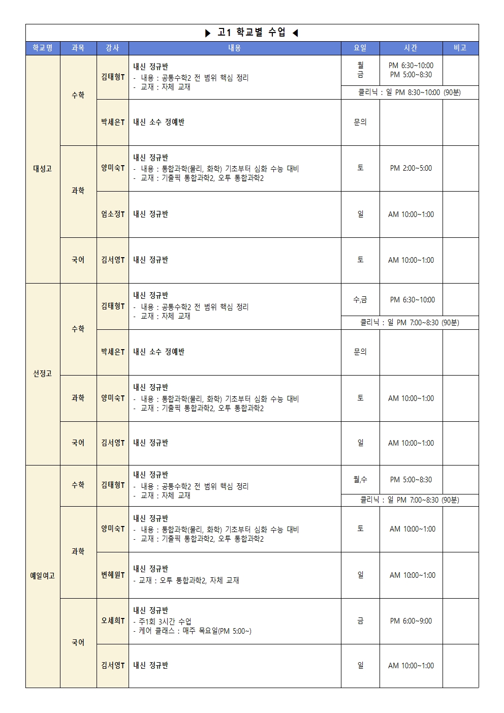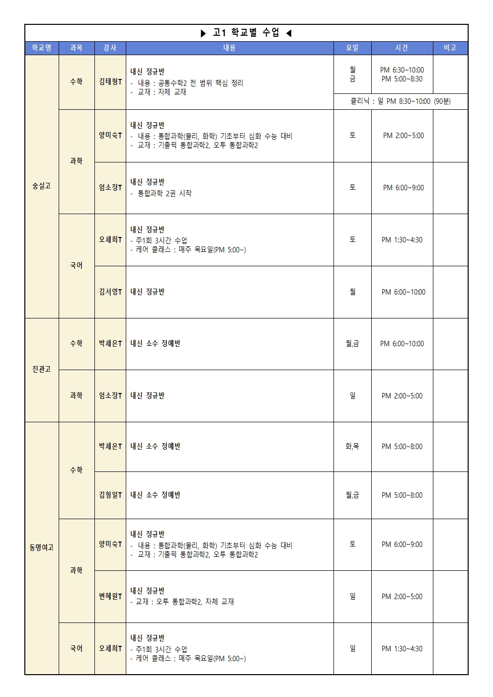 고1 - 수학/과학/국어 (2학기 시간표 )