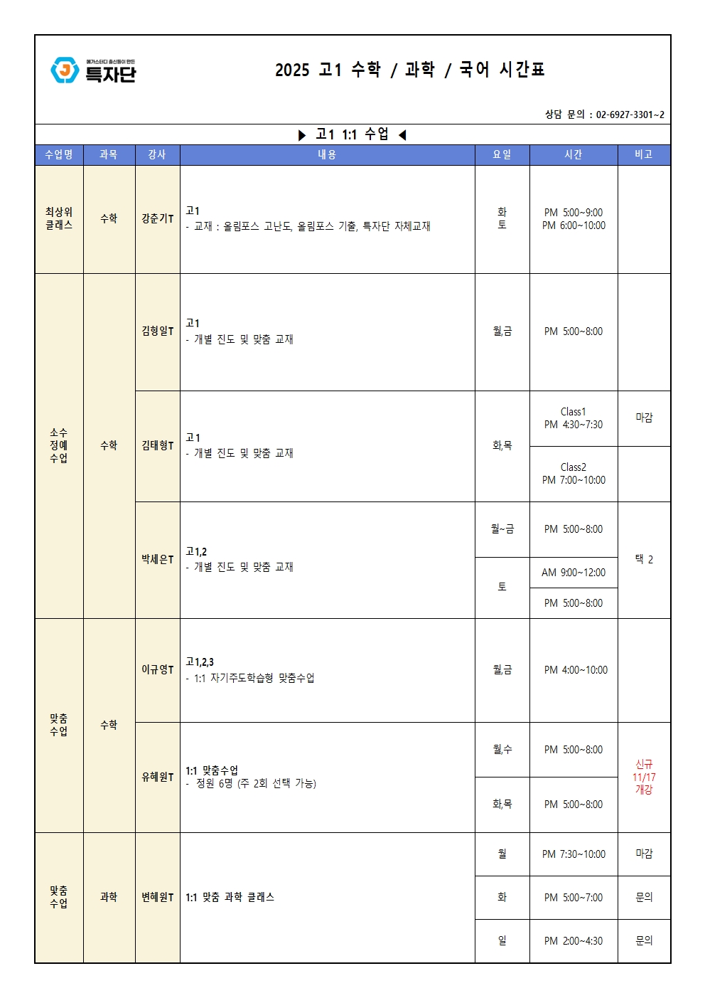 [숨긴게시글] 예비 고1 - 수학 과학 시간표 (11월 2차 개강)