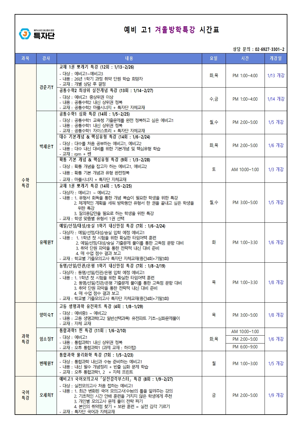 | 예비 고1 - 수학/과학/국어 (겨울방학) |
