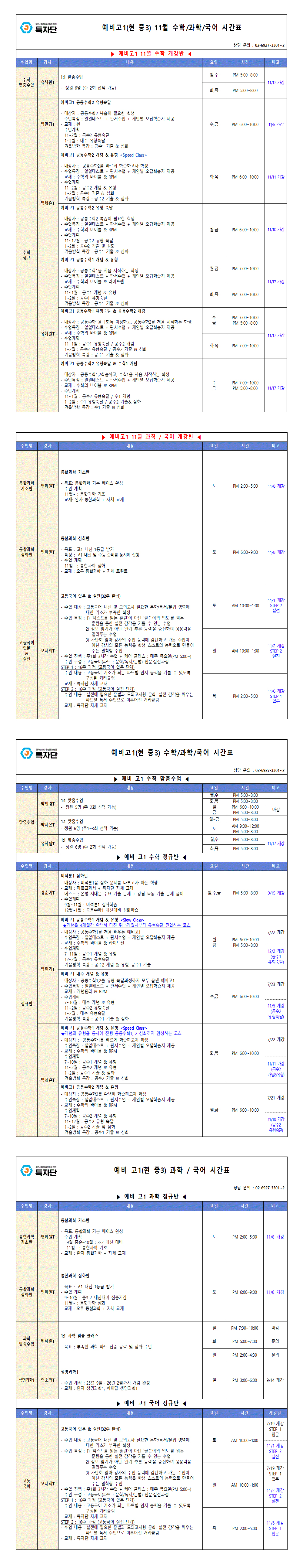 [숨긴게시글] 예비 고1 - 수학 과학 시간표 (11월 2차 개강)