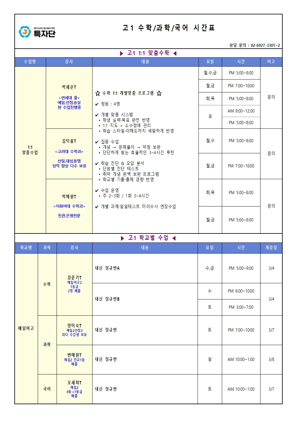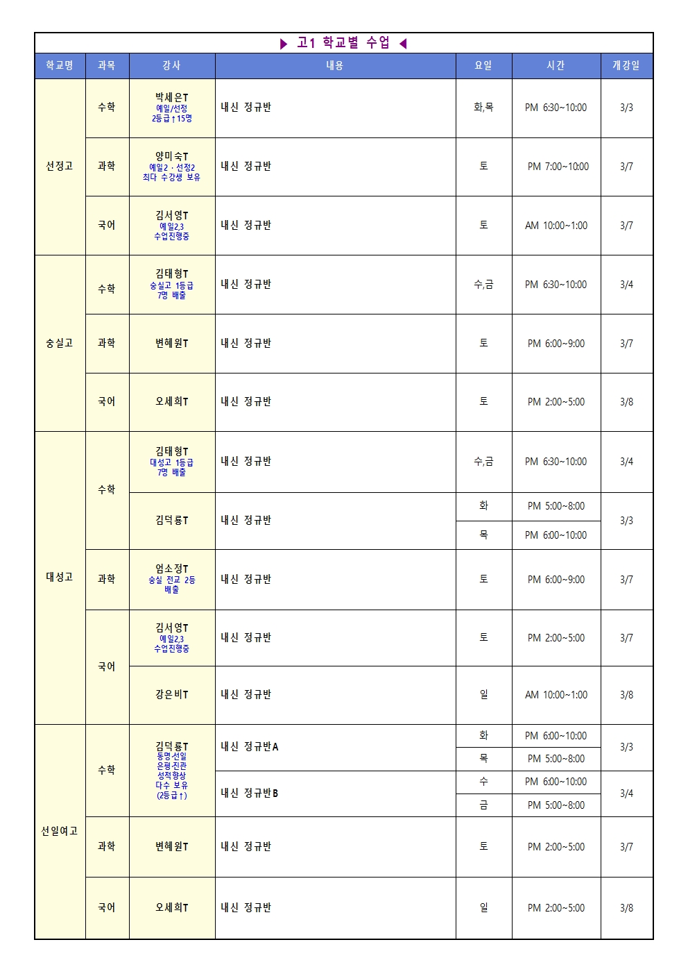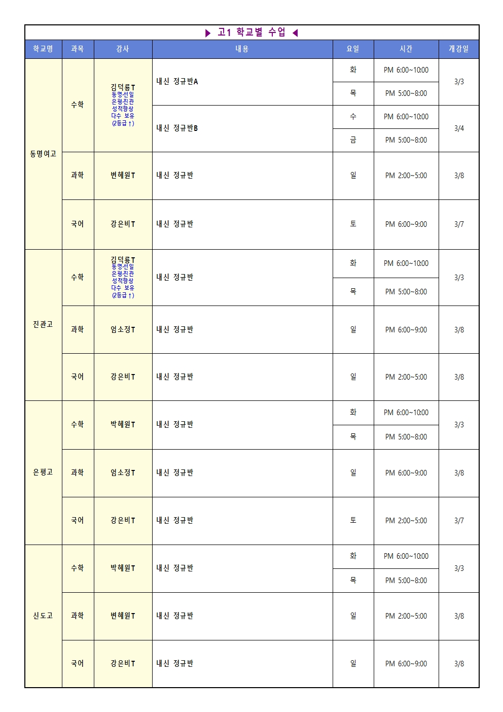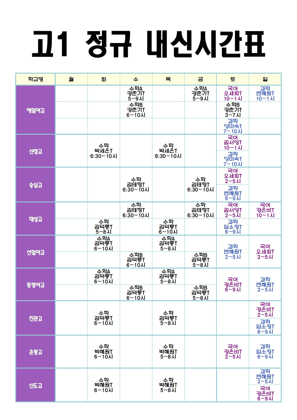 | 고등부 - 고1 시간표 - 학교 배정의 따른 시간표 (1/30) |