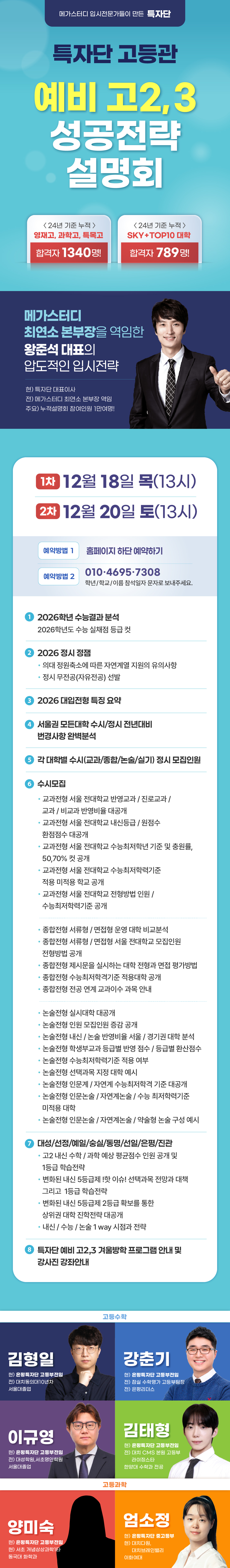 12월 - 예비 고2,3 대입성공전략 설명회 (12월 18,20) 페이지 정보 조회 137 본문 대입성공전략설명회 특자단 설명회 예약하기 설명회 선택 1차 - 예비 고2,3 - 대학입시전략 설명회 (12/18/목/13시) 2차 -예비 고2,3 - 대학입시전략 설명회 (12/20/토/13시) 통합과학&중등과학 설명회 - 12/13(토) PM1시 예비 중2,3 고교입시설명회 - 12./12(금) PM 2시 (1차) 예비 중2,3 고교입시설명회 - 12./13(토) PM 1시 (2차) 특목고 입시설명회 - 12/20(토) PM 12시(정오) 학생/학부모 성함 연락처 학교명 학년 선택 선택하세요 초4 초5 초6 중1 중2 중3 고1 고2 고3 개인정보 수집 및 이용 동의함 신청하기 개인정보 수집 및 이용 제1항 수집 항목 특자단(이하 "회사")은 수업 및 입시설명회 전화상담을 위하여 다음과 같이 최소한의 개인정보를 수집하고 있습니다.수집항목 : 이름, 휴대폰 번호 제2항 수집∙이용 목적 교육 프로그램(수업 및 입시설명회) 상담 제3항 보유 및 이용기간 가. 회사는 입력하신 정보를 1개월간 보관하며, 해당 기간이 경과한 경우에는 개인정보를 복원이 불가능한 방법으로 파기합니다. 다만, 이용자가 마케팅 이용에 동의한 경우는 예외로 합니다. 나. 입력하신 개인정보는 『전자상거래 등에서의 소비자보호에 관한 법률』과 관련이 없기에 별도의 보관을 하지 아니합니다. 제4항 동의 거부 및 불이익 개인정보의 수집∙이용에 대한 동의를 거부하실 수 있니다. 하지만 개인정보의 수집∙이용 동의를 거부하실 때에는 접수가 불가능합니다. 카카오톡 공유하기 좋은 교육정보 함께 공유해요! SNS 공유