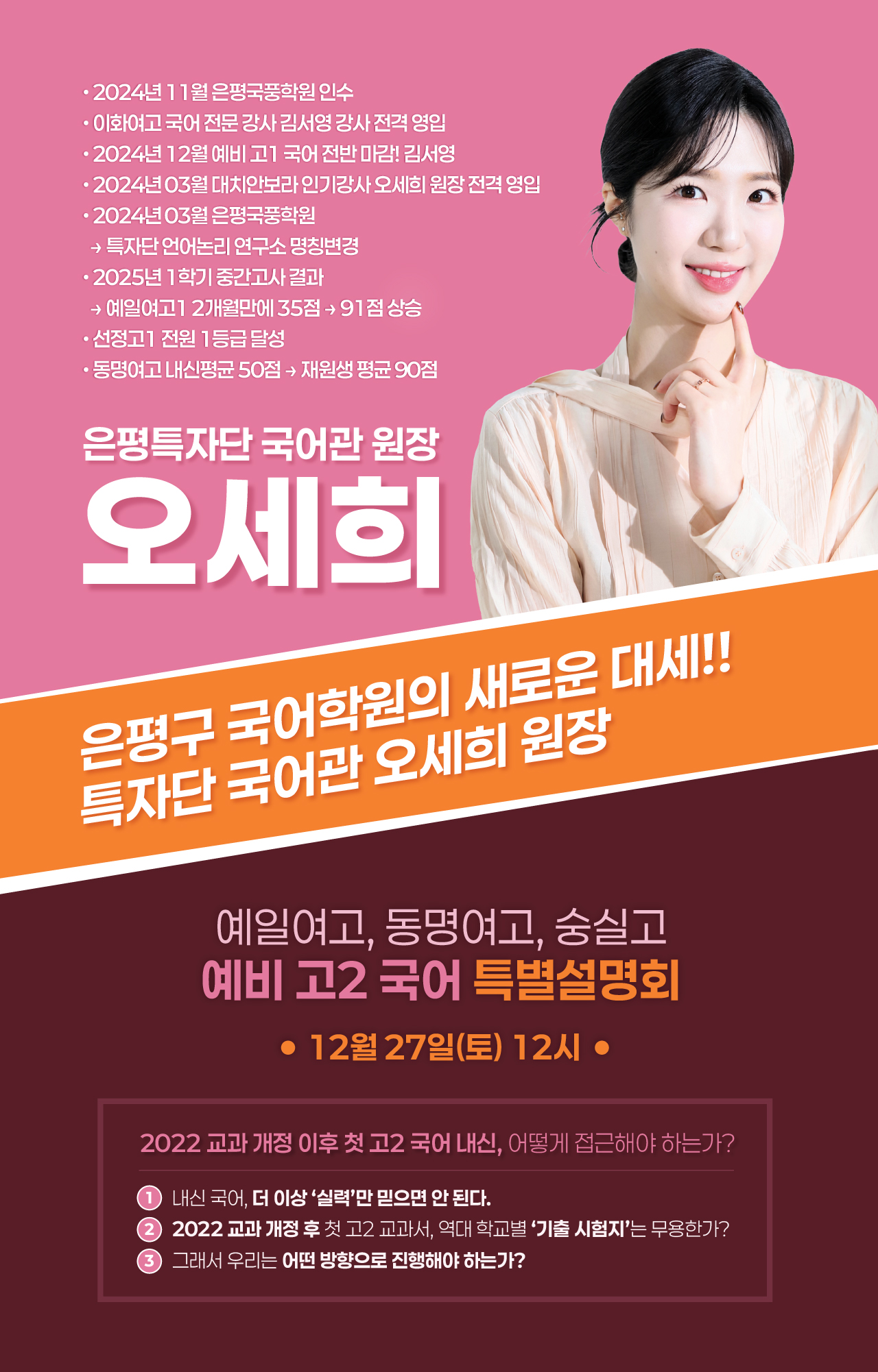 고등부 - 예비 고2 오세희 원장 국어 설명회 (예일/동명/숭실) 페이지 정보 조회 451 본문 오세희 원장 설명회 [이 게시물은 최고관리자님에 의해 2026-01-29 14:45:10 초중고 시간표에서 이동 됨] 특자단 설명회 예약하기 설명회 선택 대성고 - 2/3(화) PM 7:00 숭실고 - 2/3(화) PM 7:00 예일여고 - 2/5(목) PM 7:00 선정고 - 2/5(목) PM 7:00 동명여고 - 2/4(수) PM 7:00 선일여고 - 2/4(수) PM 7:00 진관고 - 2/6(목) PM 7:00 은평고 - 2/6(목) PM 7:00 학생/학부모 성함 연락처 학교명 학년 선택 선택하세요 초4 초5 초6 중1 중2 중3 고1 고2 고3 개인정보 수집 및 이용 동의함 신청하기 개인정보 수집 및 이용 제1항 수집 항목 특자단(이하 "회사")은 수업 및 입시설명회 전화상담을 위하여 다음과 같이 최소한의 개인정보를 수집하고 있습니다.수집항목 : 이름, 휴대폰 번호 제2항 수집∙이용 목적 교육 프로그램(수업 및 입시설명회) 상담 제3항 보유 및 이용기간 가. 회사는 입력하신 정보를 1개월간 보관하며, 해당 기간이 경과한 경우에는 개인정보를 복원이 불가능한 방법으로 파기합니다. 다만, 이용자가 마케팅 이용에 동의한 경우는 예외로 합니다. 나. 입력하신 개인정보는 『전자상거래 등에서의 소비자보호에 관한 법률』과 관련이 없기에 별도의 보관을 하지 아니합니다. 제4항 동의 거부 및 불이익 개인정보의 수집∙이용에 대한 동의를 거부하실 수 있니다. 하지만 개인정보의 수집∙이용 동의를 거부하실 때에는 접수가 불가능합니다. 카카오톡 공유하기 좋은 교육정보 함께 공유해요! SNS 공유